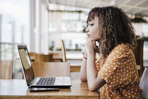 Hispanic woman with curly hair leaning chin on hand sitting at table with laptop and smartphone in cafe