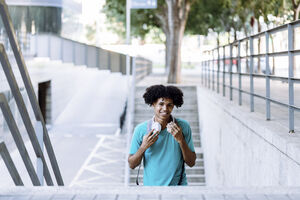 Smiling Black man looking away with hands clasped sitting on staircase in city
