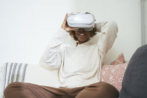 Smiling mixed-race woman putting headphones on caucasian boyfriend working on tablet while sitting on floor at home