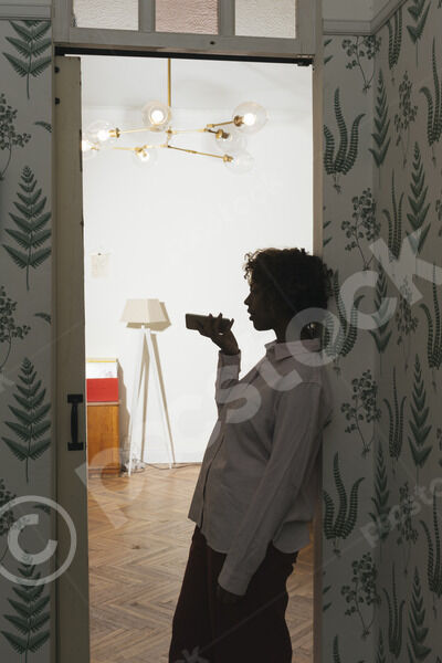 Smiling mixed-race female fashion designer standing with crossed arms against wall in living room at home