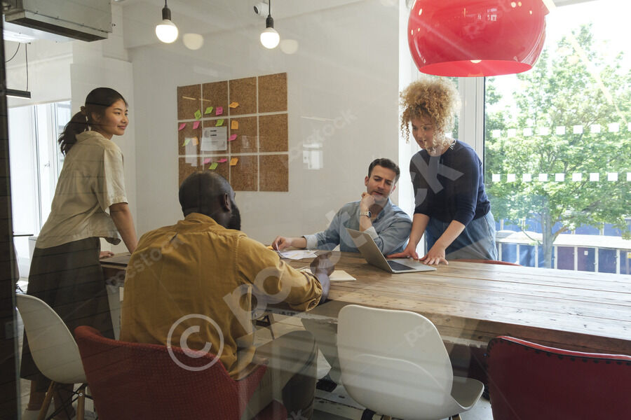 African American business woman writing on adhesive notes on glass wall beside european male colleague in office