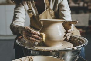 Black woman with curly hair holding gold bitcoin with both hands while standing in front of white wall in studio