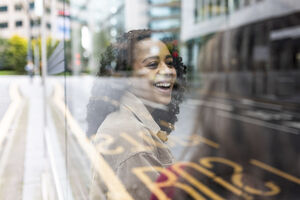 Black woman with afro hair looking away having phone conversation standing in front of glass wall in office