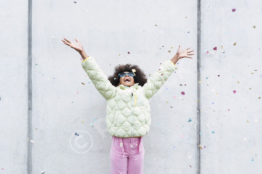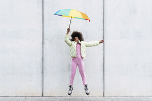 Smiling Black business woman with short curly hair holding wind turbine model while skateboarding with arms outstretched in city