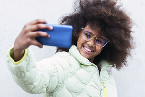 Smiling Black business woman with short curly hair holding tablet leaning on retaining wall in city