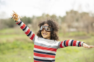 Smiling Hispanic boy with curly hair wearing aviator glasses playing with wooden toy airplane outdoors