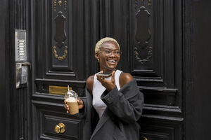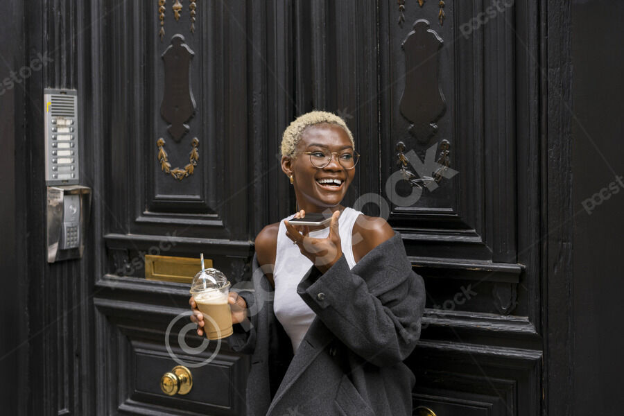 Black woman with white short hair wearing eyeglasses looking away recording voice message on smartphone holding takeaway iced coffee standing against door outdoors