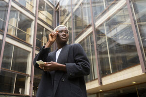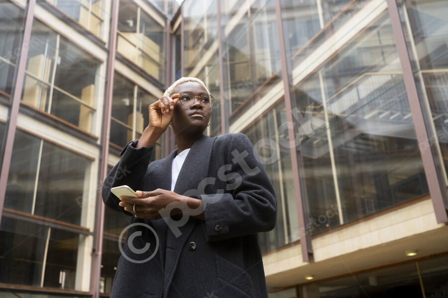 Black business woman with white short hair touching eyeglasses looking away holding smartphone while standing outside the office building