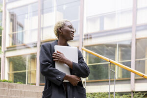 Black business woman with white short hair wearing eyeglasses holding laptop looking away while standing on outdoors stairs in city during daytime