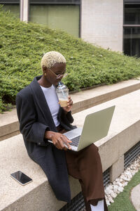 Black business woman with white short hair wearing eyeglasses using laptop drinking iced coffee while sitting with crossed legs on concrete bench in city park