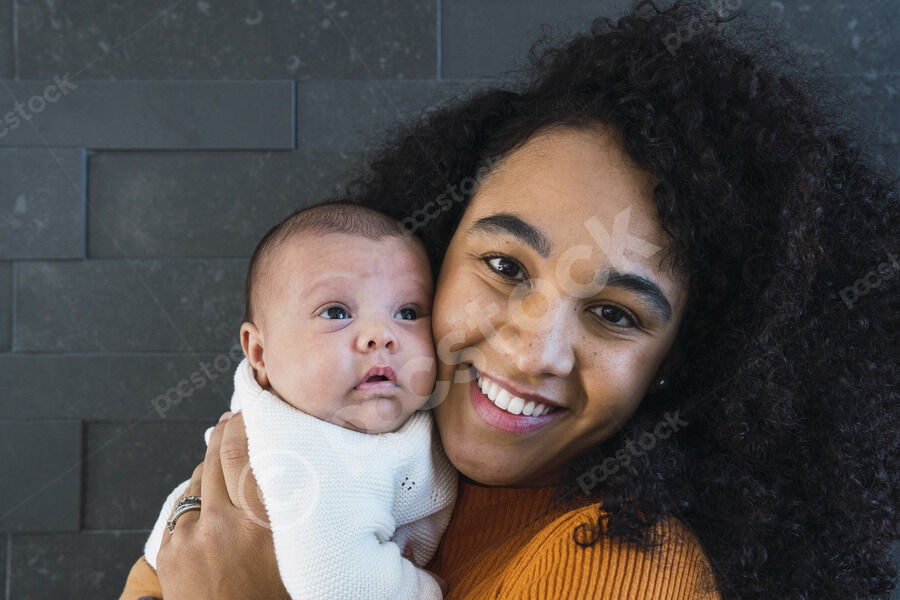 Smiling Black man looking away with hand on his waist standing against black brick wall in city street during daytime