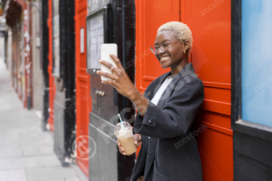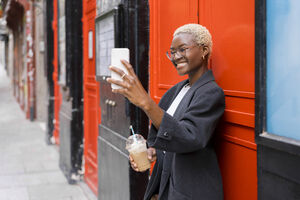 Smiling Black business woman with white short hair wearing eyeglasses holding takeaway iced coffee using smartphone taking selfie while standing against red door on street