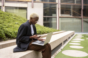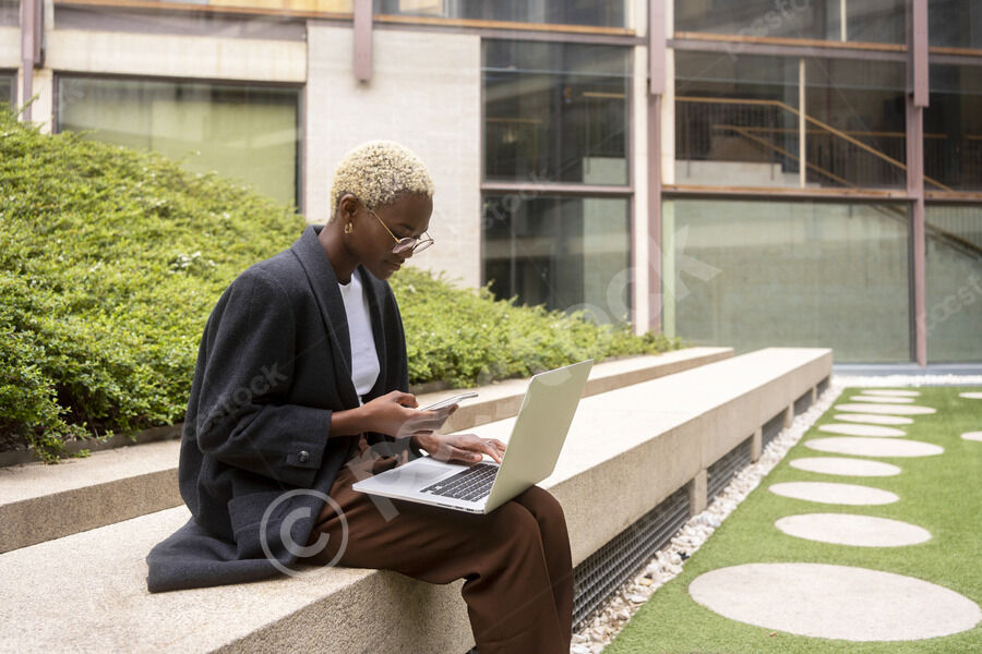 Black business woman with white short hair wearing eyeglasses using laptop and smartphone while sitting on concrete bench in city park