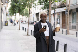 Black business woman with white short hair wearing eyeglasses holding takeaway iced coffee using smartphone while walking on city street during daytime