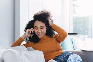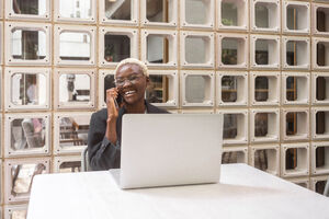 Cheerful Black business woman with white short hair wearing eyeglasses having phone call while sitting at table with laptop in cafe