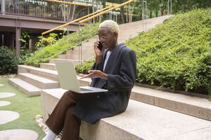 Black business woman with white short hair wearing eyeglasses having phone call using laptop while sitting on concrete bench in city park during daytime
