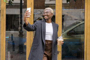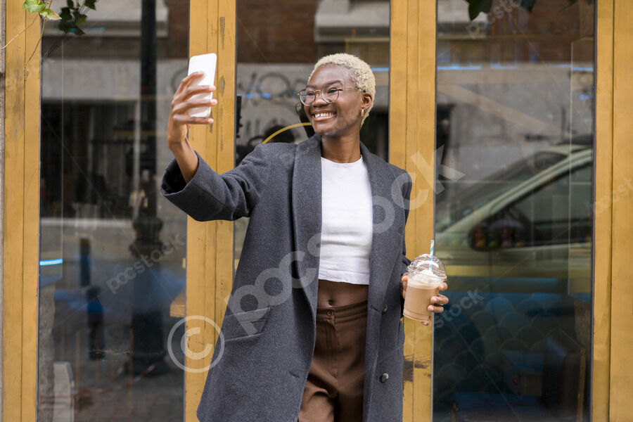 Black business woman with white short hair wearing eyeglasses holding takeaway iced coffee using smartphone taking selfie while standing against glass door outdoors