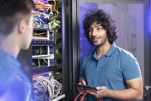 Mixed-race female engineer wearing hardhat and safety vest holding tablet and looking at cables while standing in server room