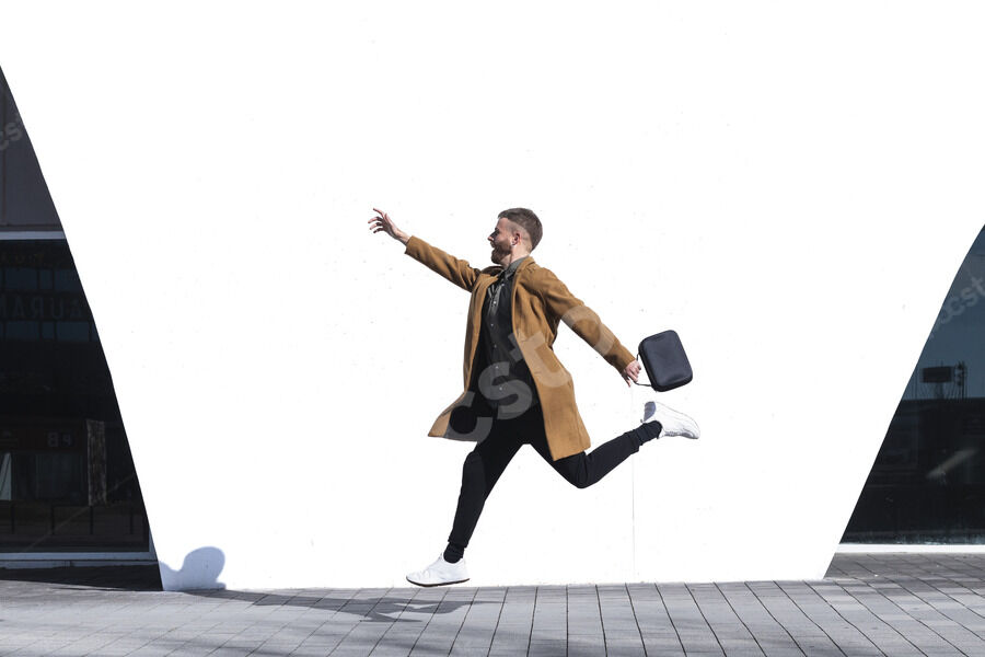 Black man with afro jumping with clenched fists on city street during daytime