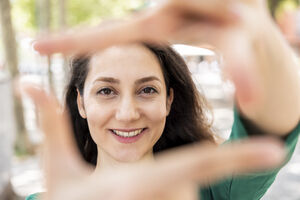Mixed-race business woman with curly hair holding folders hugging caucasian colleagues while standing in office