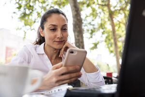 Hispanic senior businessman looking away holding smartphone standing near building in city during daytime