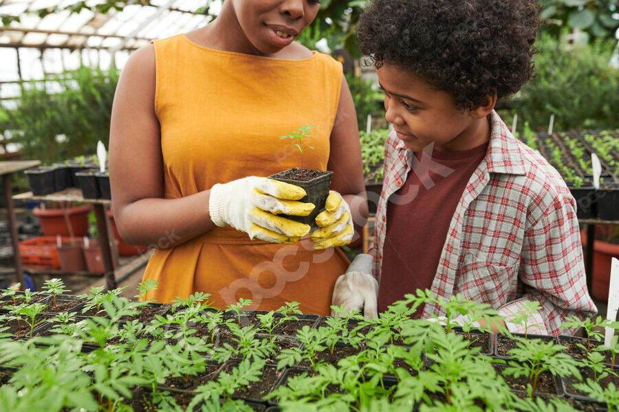 Hands of Black male gardener transplanting plant in pot while standing in greenhouse during daytime