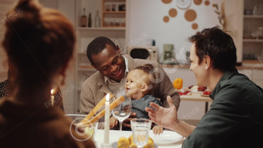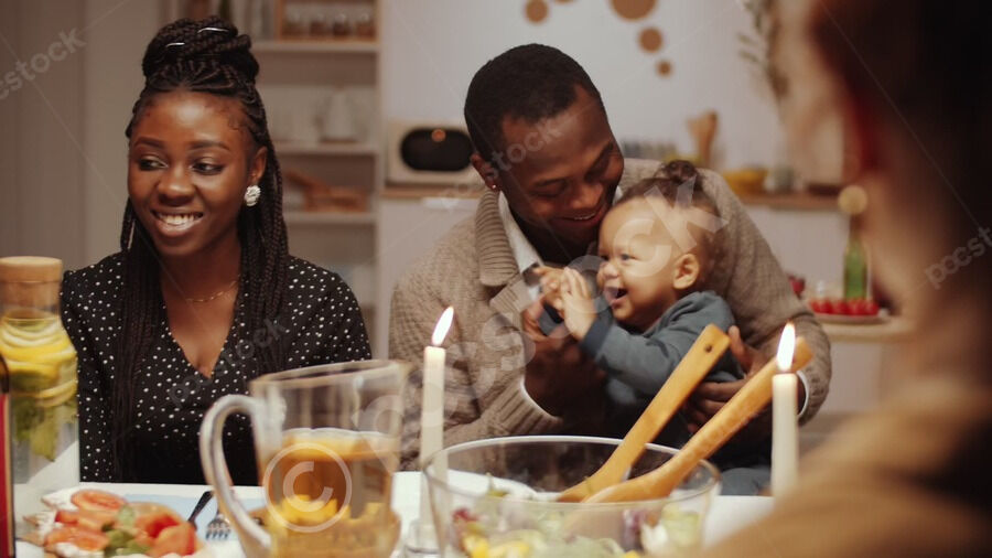 Black family having dinner together celebrating Kwanzaa holiday at home