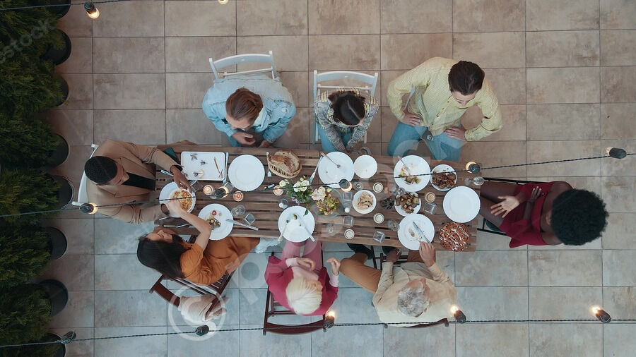 High angle view of Black family eating together sitting at dining table during dinner at home
