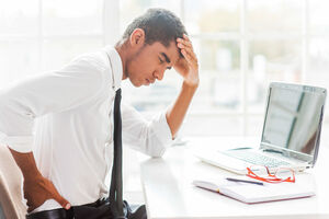 Black businessman keeping eyes closed while suffering from headache standing in office