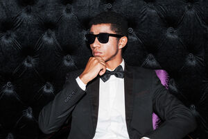 Black businessman keeping eyes closed holding hands behind head while lying on couch in office