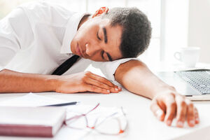 Black businessman hands at laptop keyboard while sleeping on couch in office