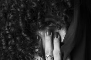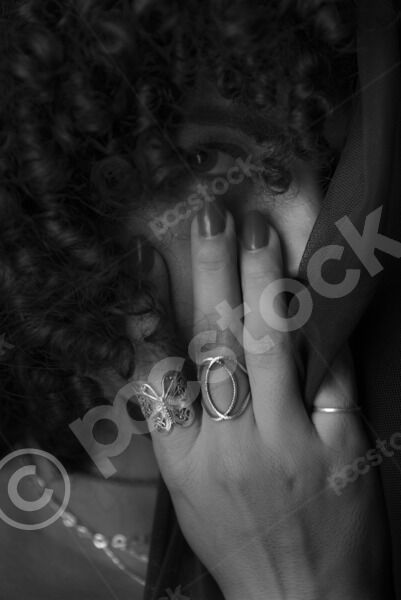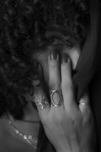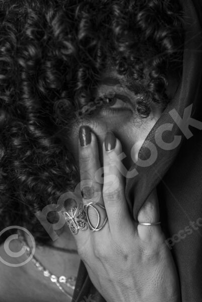 Black and white image close-up of Black woman with curly hair wearing rings covering her face with cloth against dark background