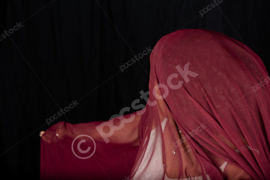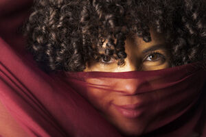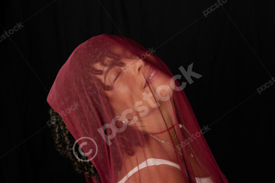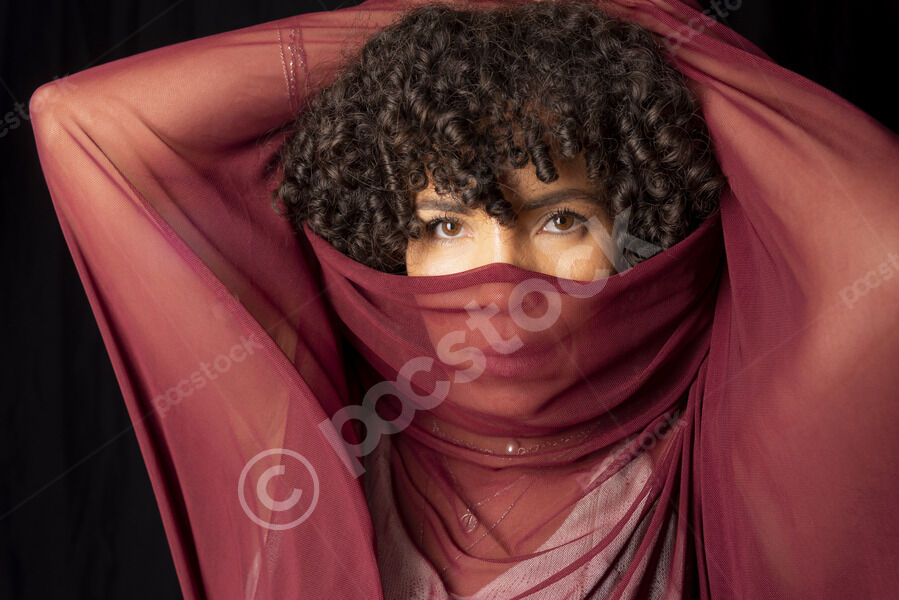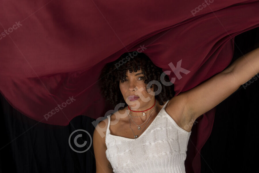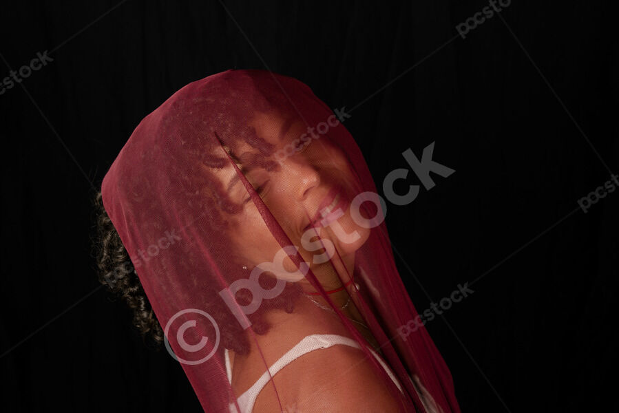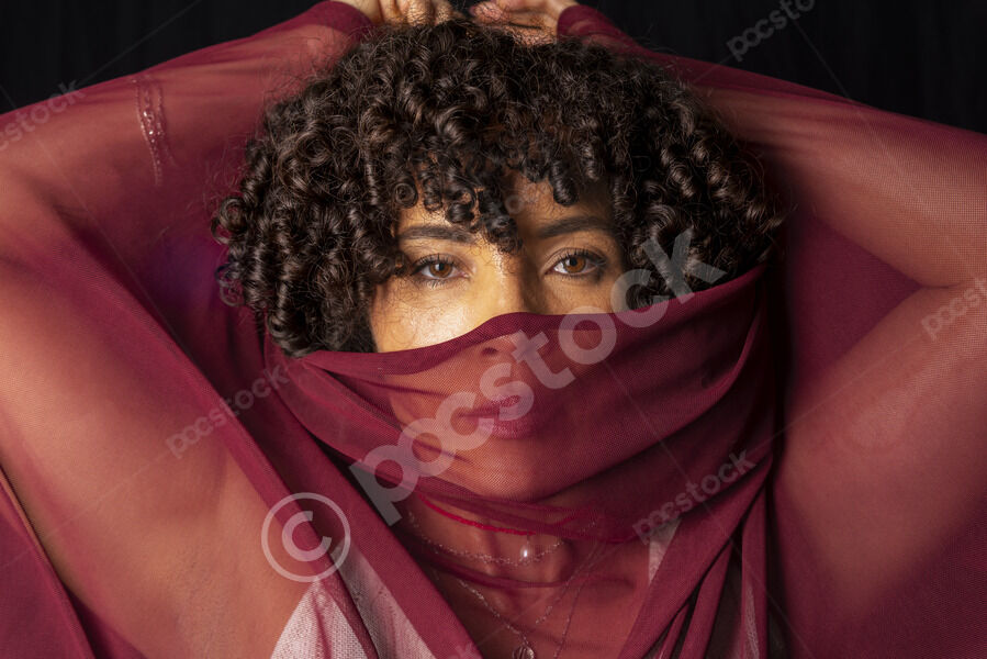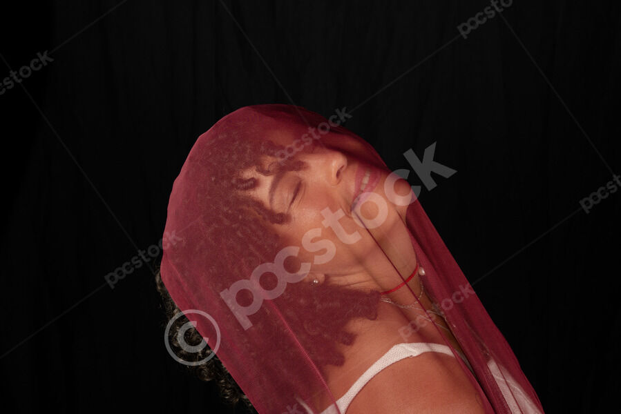 Black woman with curly hair holding a thin dark red cloth over her head standing against black background
