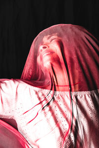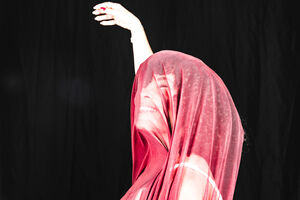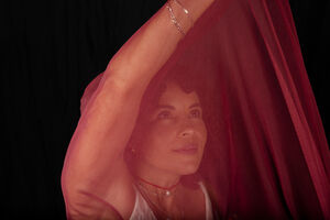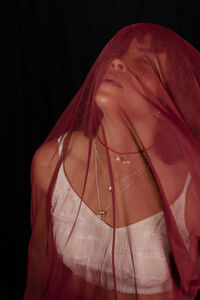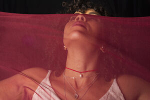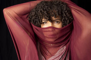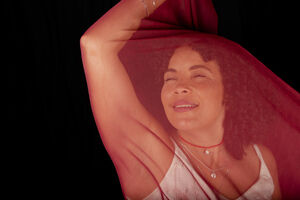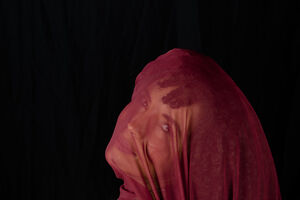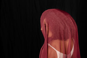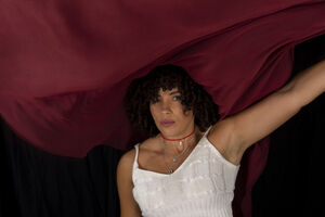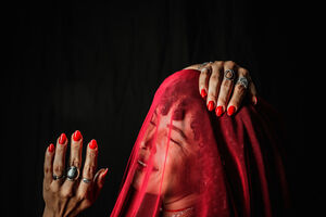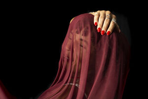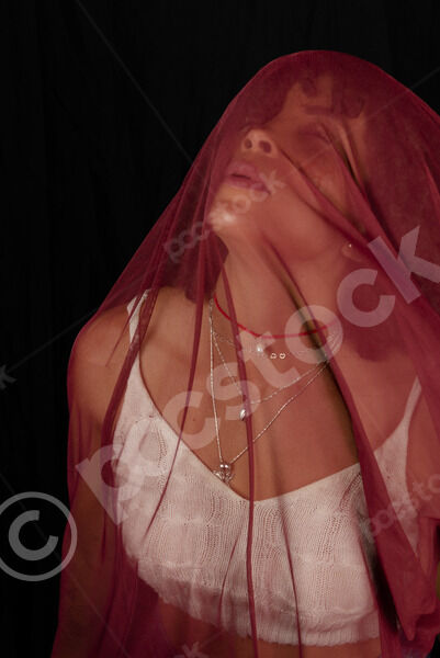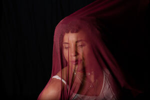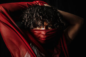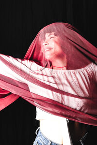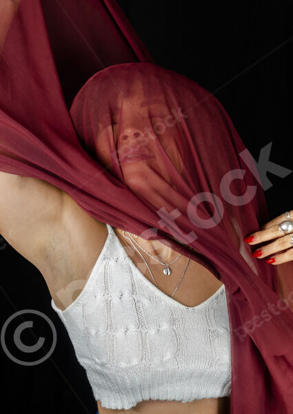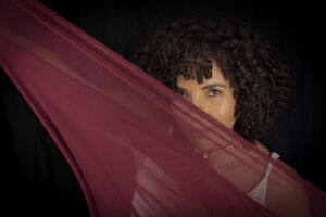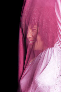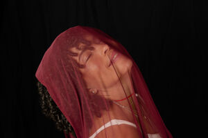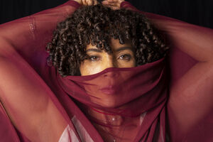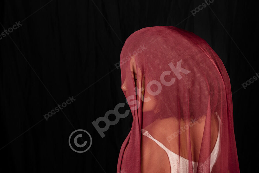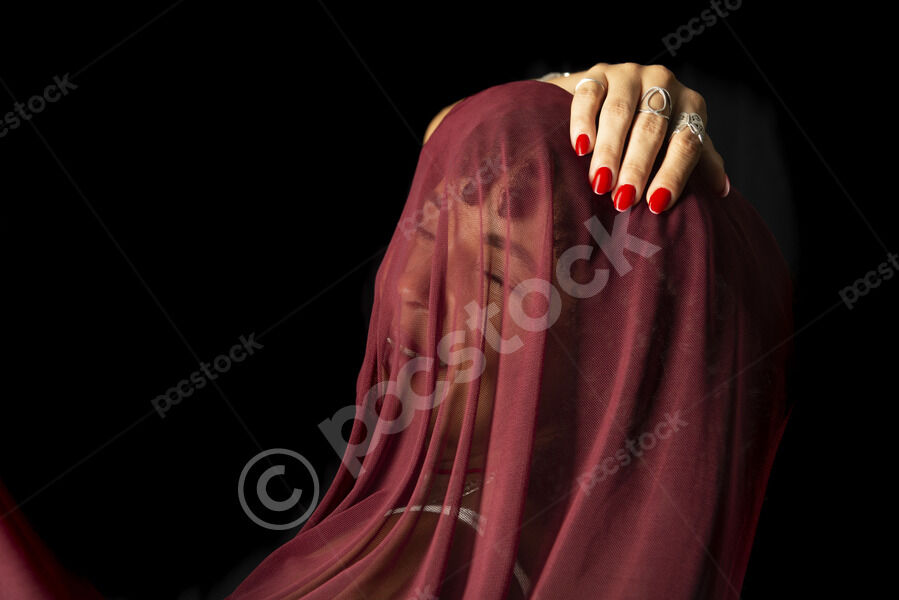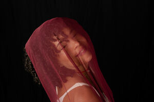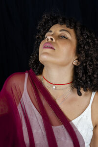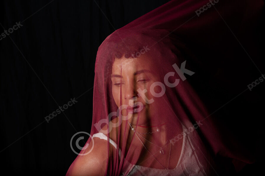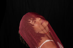 Black woman with curly hair holding a thin dark red cloth over her head standing against black background