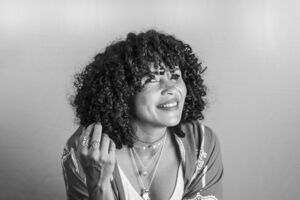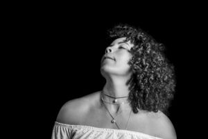Black and white image of Black woman with curly hair wearing an off-the-shoulder top tilting her head backwards while standing against dark background in studio