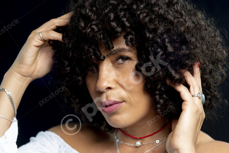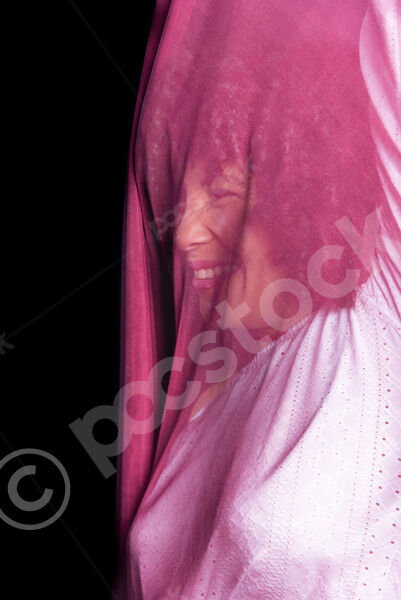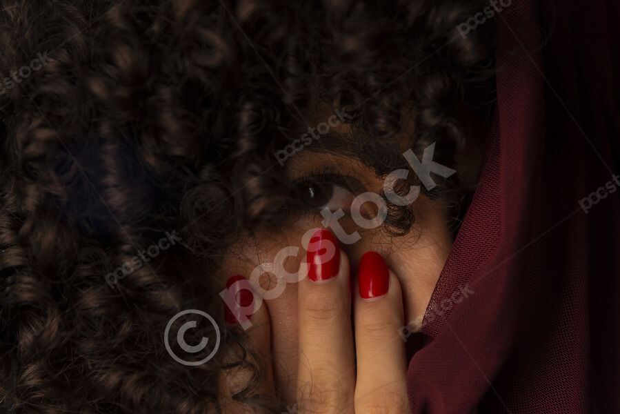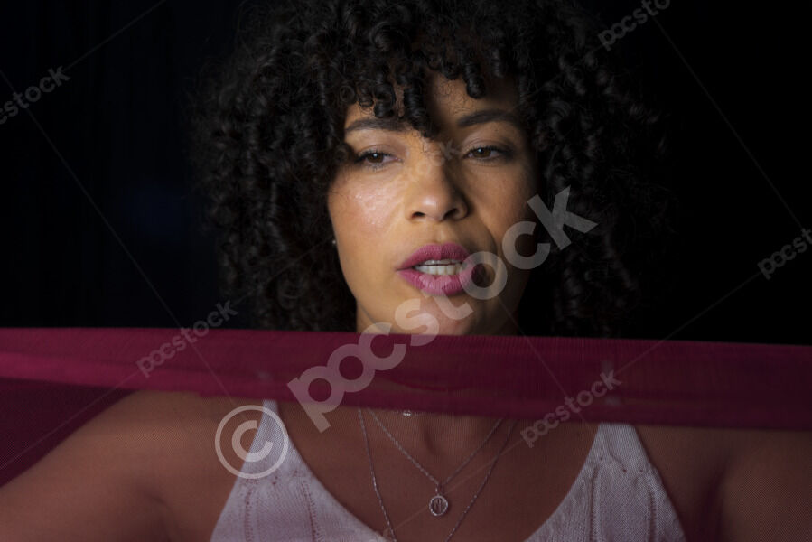Close-up of Black woman with curly hair covering her face with cloth against dark background in studio