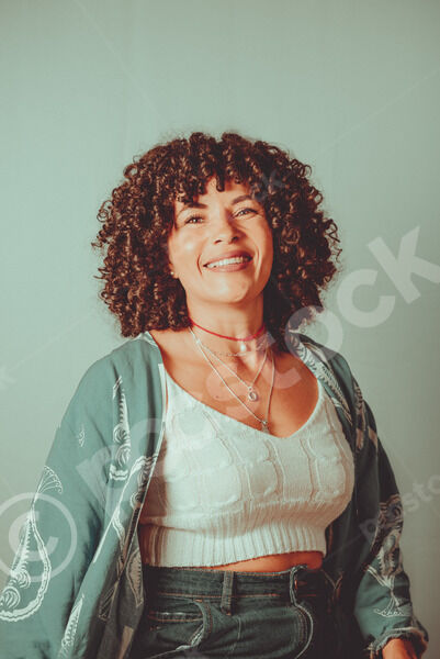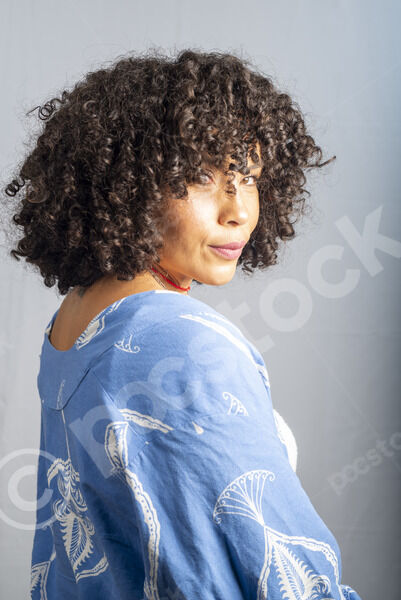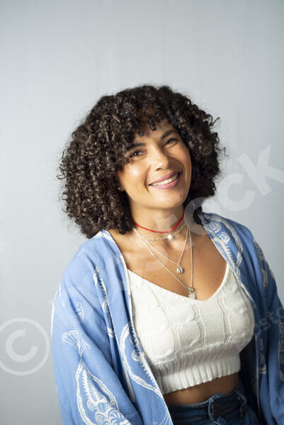 Black woman touching her curly hair and smiling while standing against light background in studio