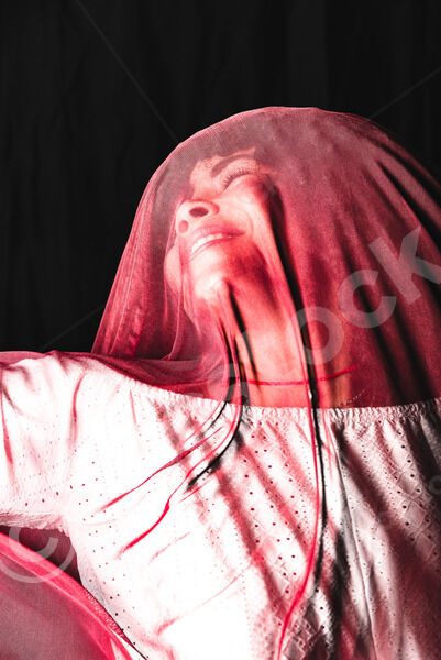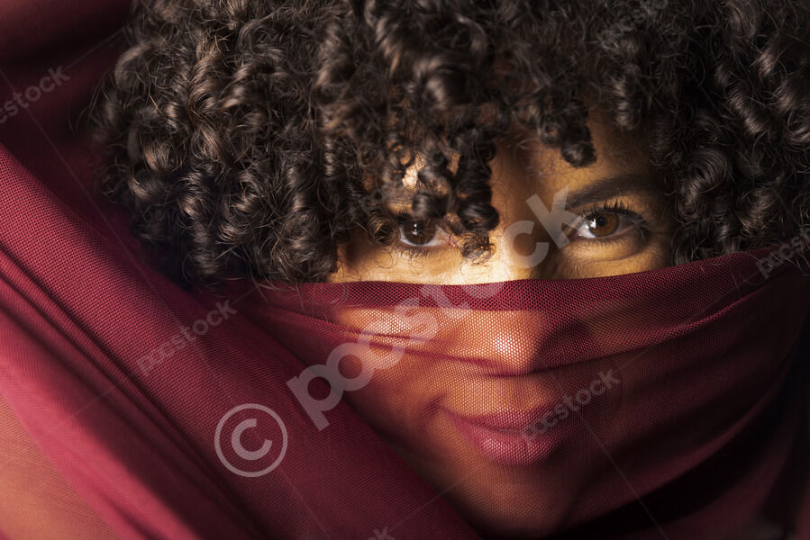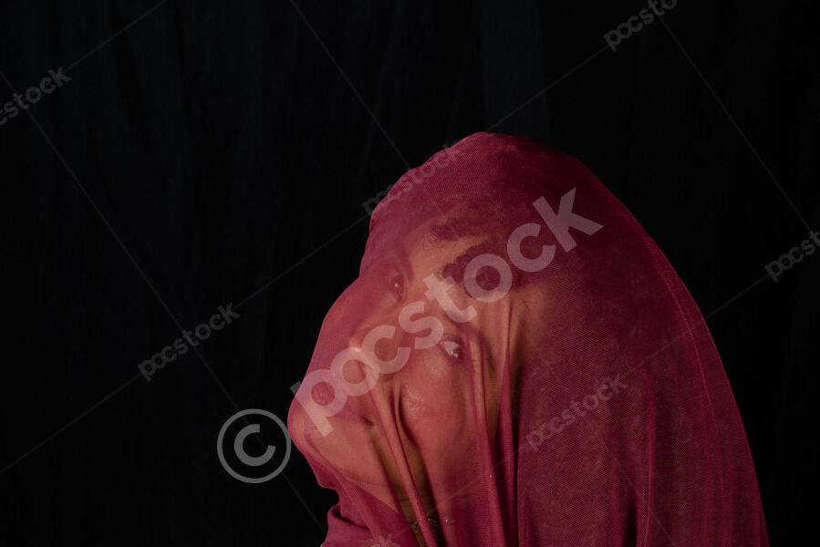 Black woman with thin red cloth over her face having fun while standing against dark background in studio