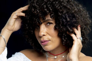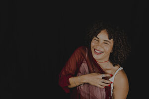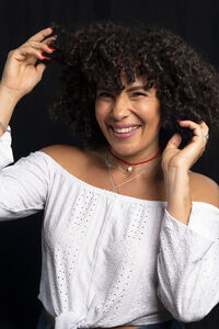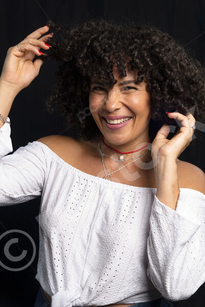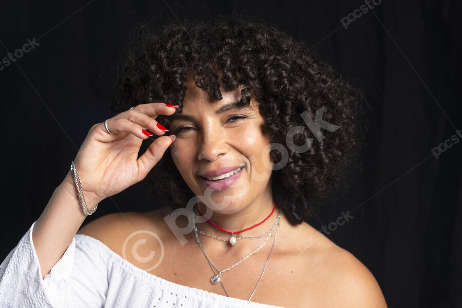 Black woman wearing an off-the-shoulder top touching her curly hair and smiling while standing against dark background in studio