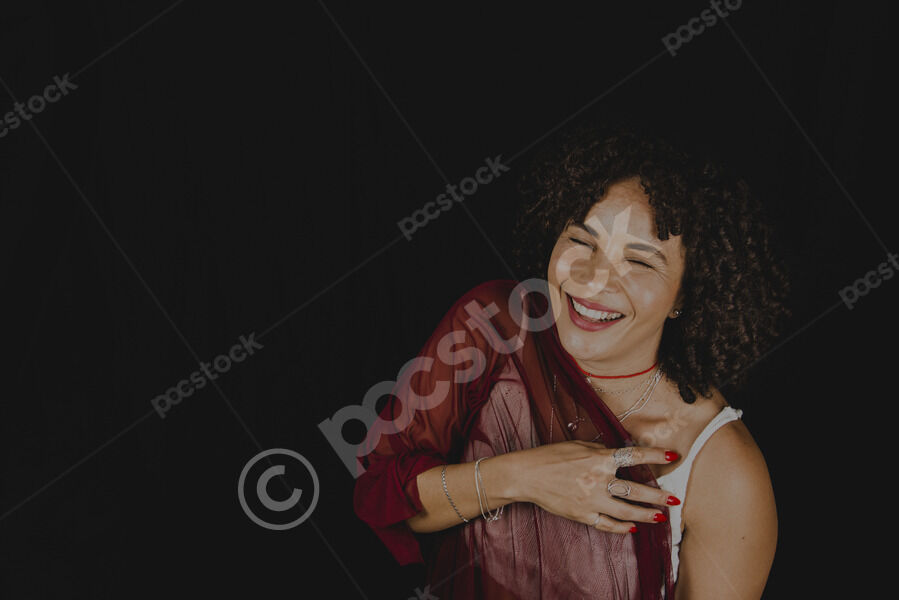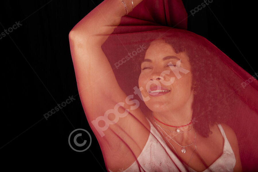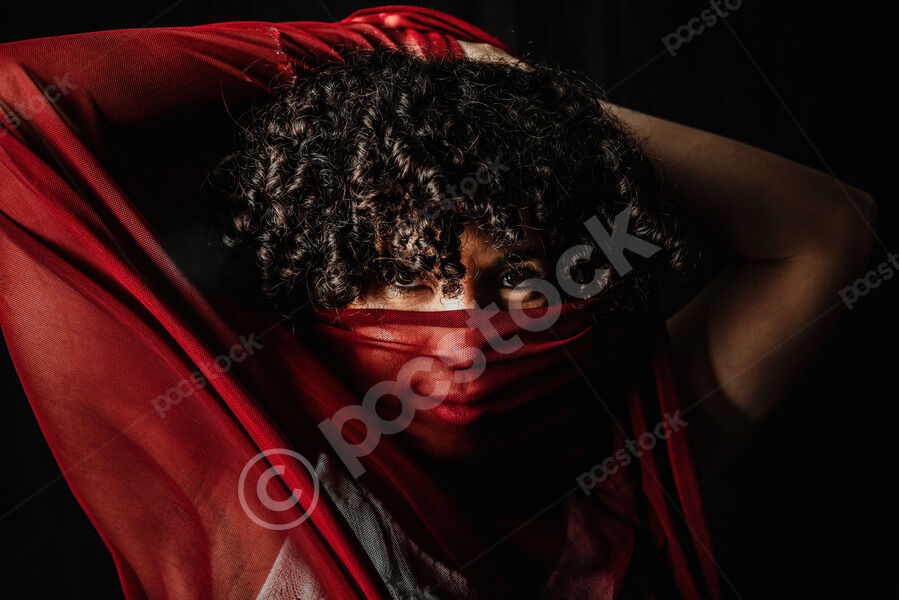 Black woman with curly hair raising her arms holding thin red cloth covering her face while standing against dark background in studio
