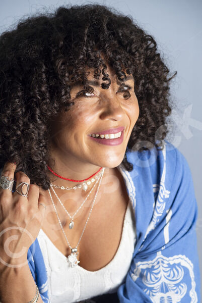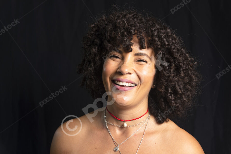 Black woman with curly hair laughing while sitting on wooden stool against light background in studio