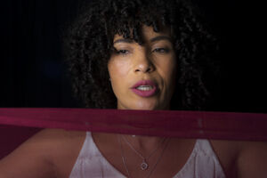 Black woman with curly hair holding thin red cloth standing against dark background in studio
