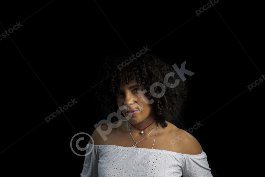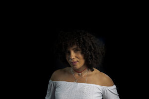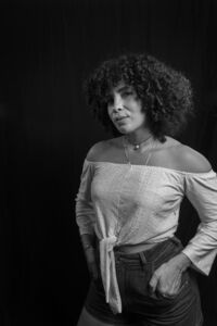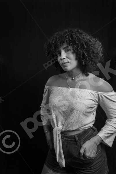 Black woman with curly hair wearing an off-the-shoulder top standing against dark background in studio