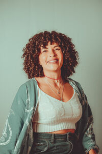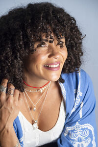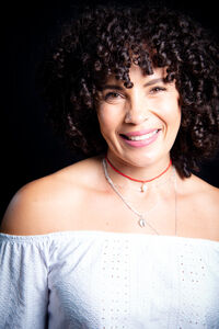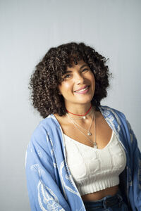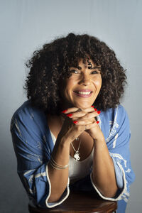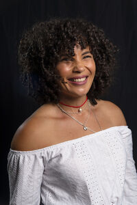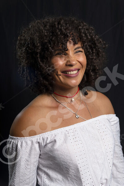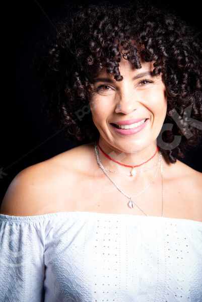 Black woman with curly hair wearing an off-the-shoulder top smiling while standing against dark background in studio