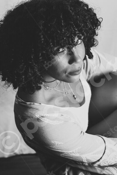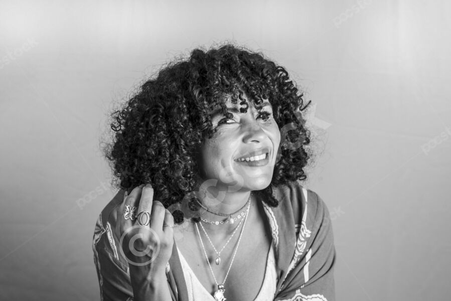 Black and white image of Black woman touching her curly hair and smiling while standing against light background in studio