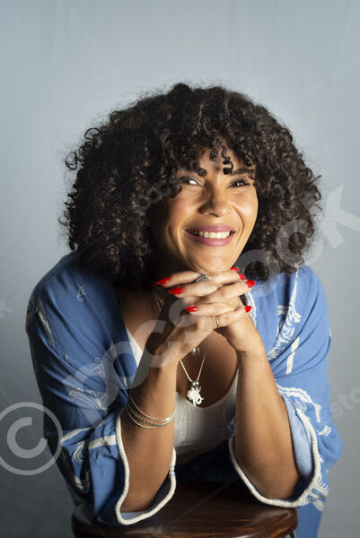 Black woman with curly hair leaning her chin on clasped hands and smiling while leaning forward on wooden stool against gray background in studio