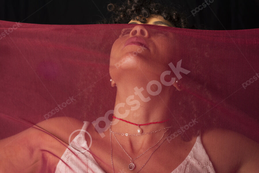 Black woman with curly hair tilting her head backwards and holding think red cloth on her face while standing against dark background in studio