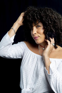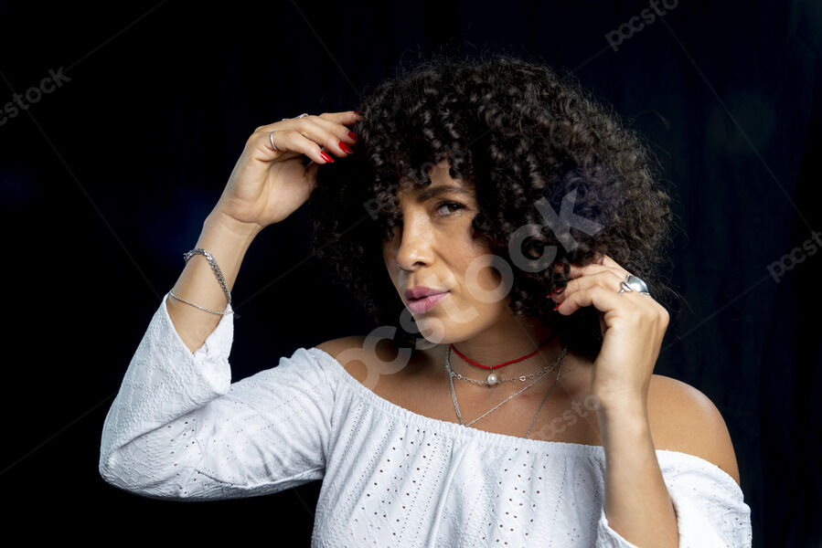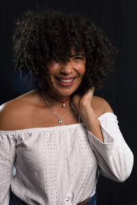Black woman wearing an off-the-shoulder top touching her curly hair and smiling while standing against dark background in studio