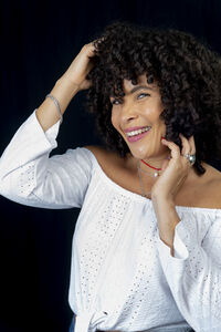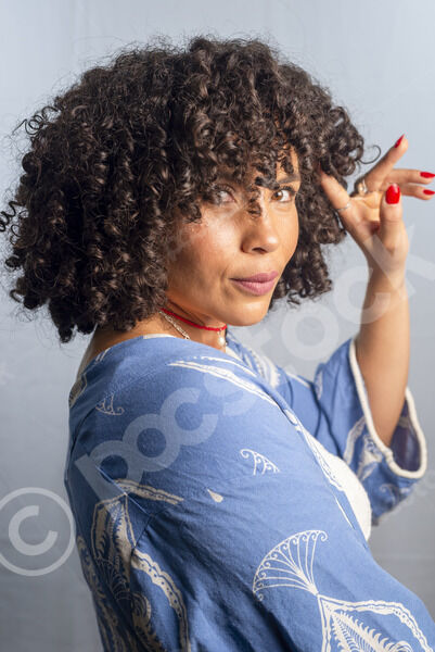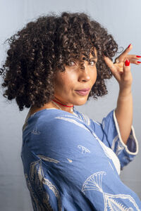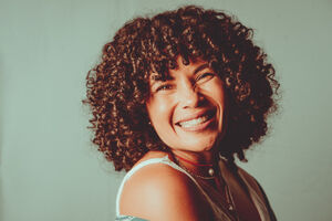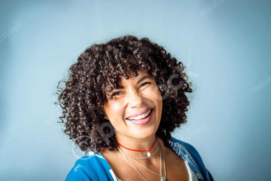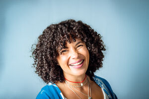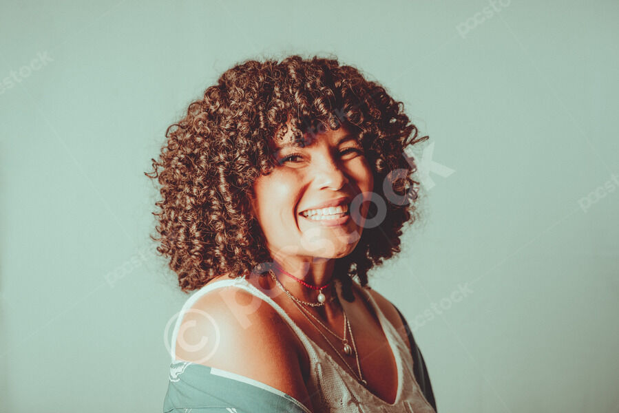 Black woman with curly hair smiling standing sideways against turquoise background in studio
