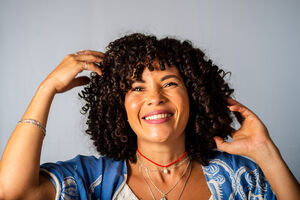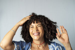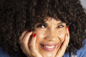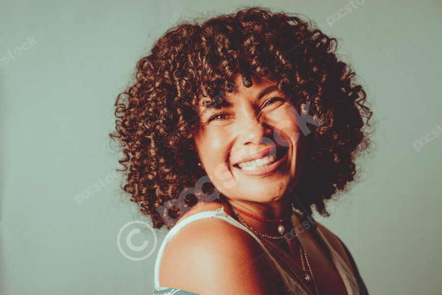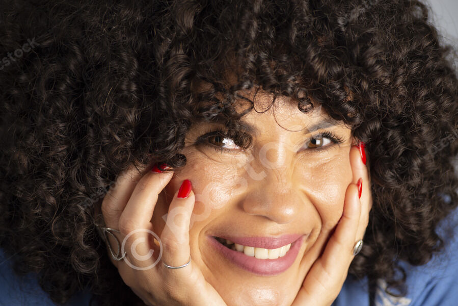 Close-up of Black woman with curly hair leaning her face on her hands smiling against light background in studio